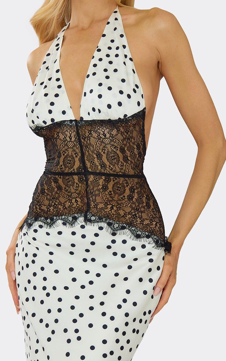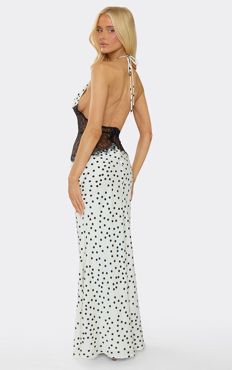 Halterneck Plunge Contrast Lace Maxi Dress In White Polka Dot
