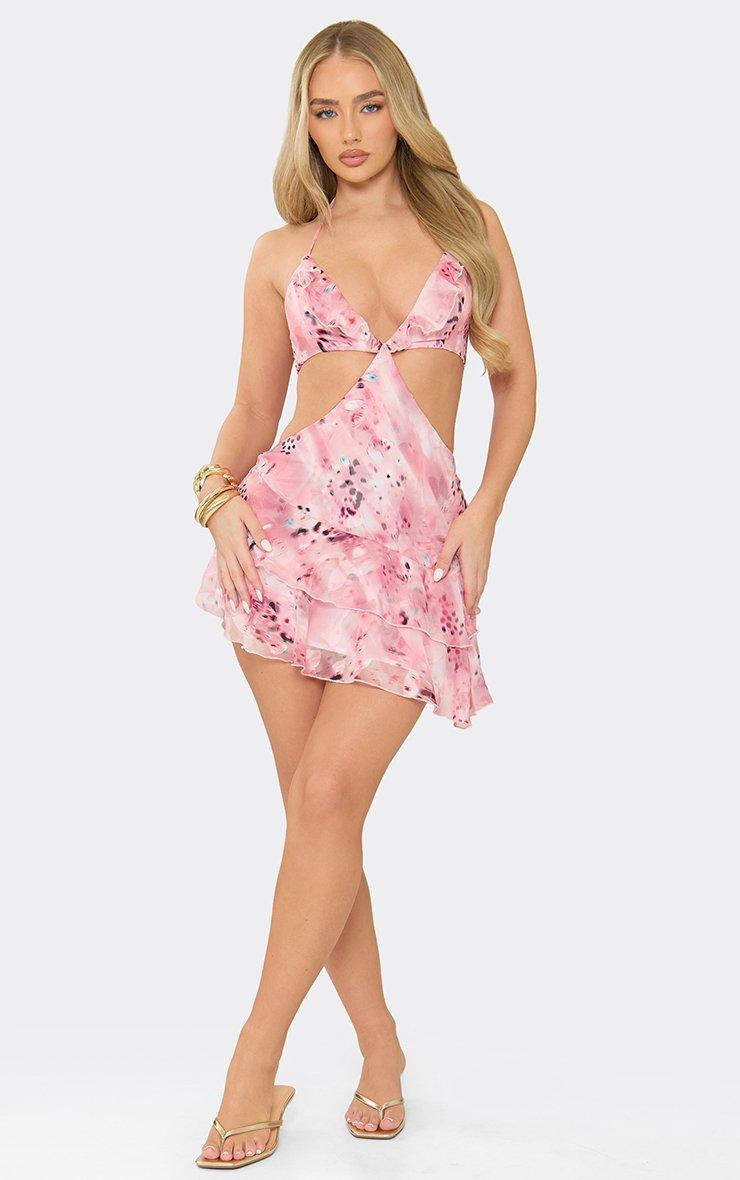 Halterneck Cut Out Frill Mini Dress In Pink Floral