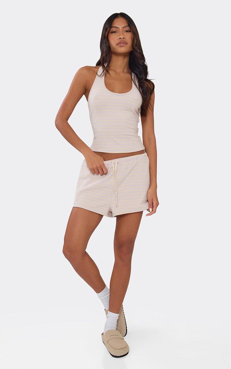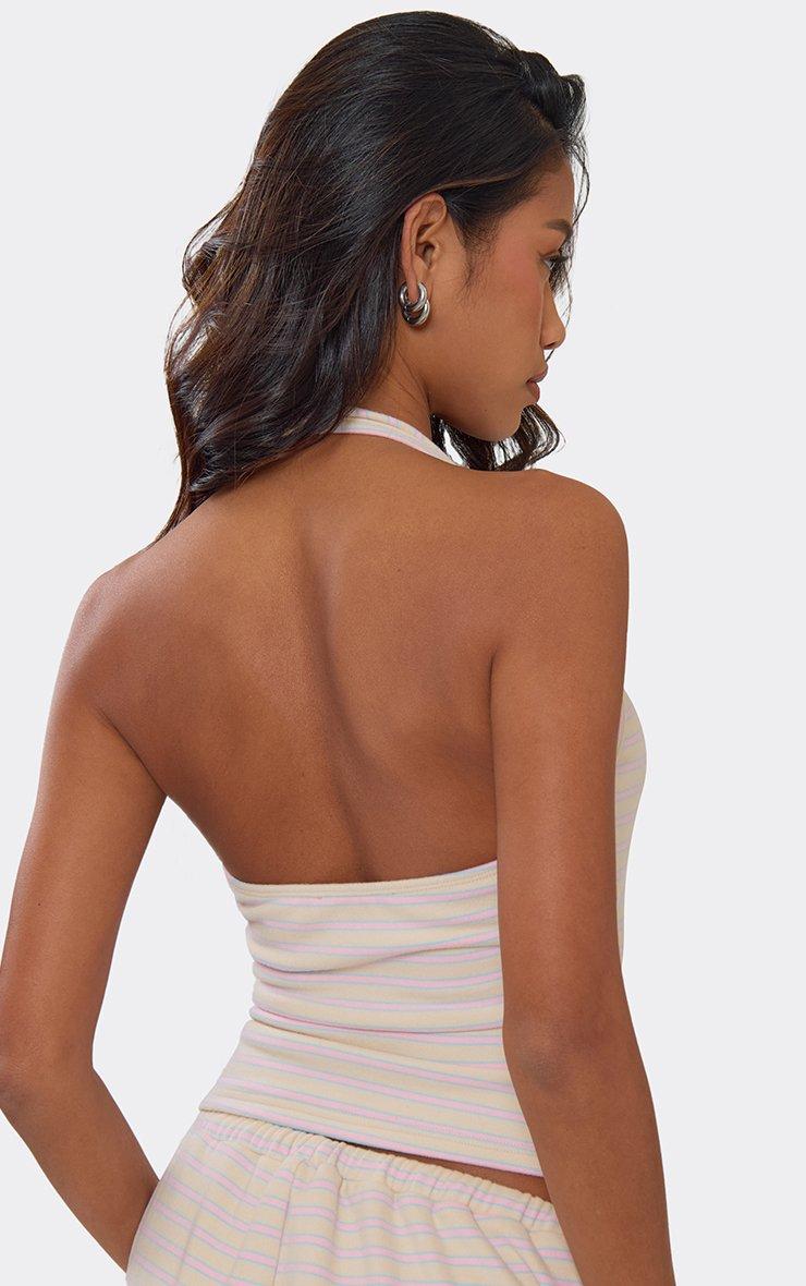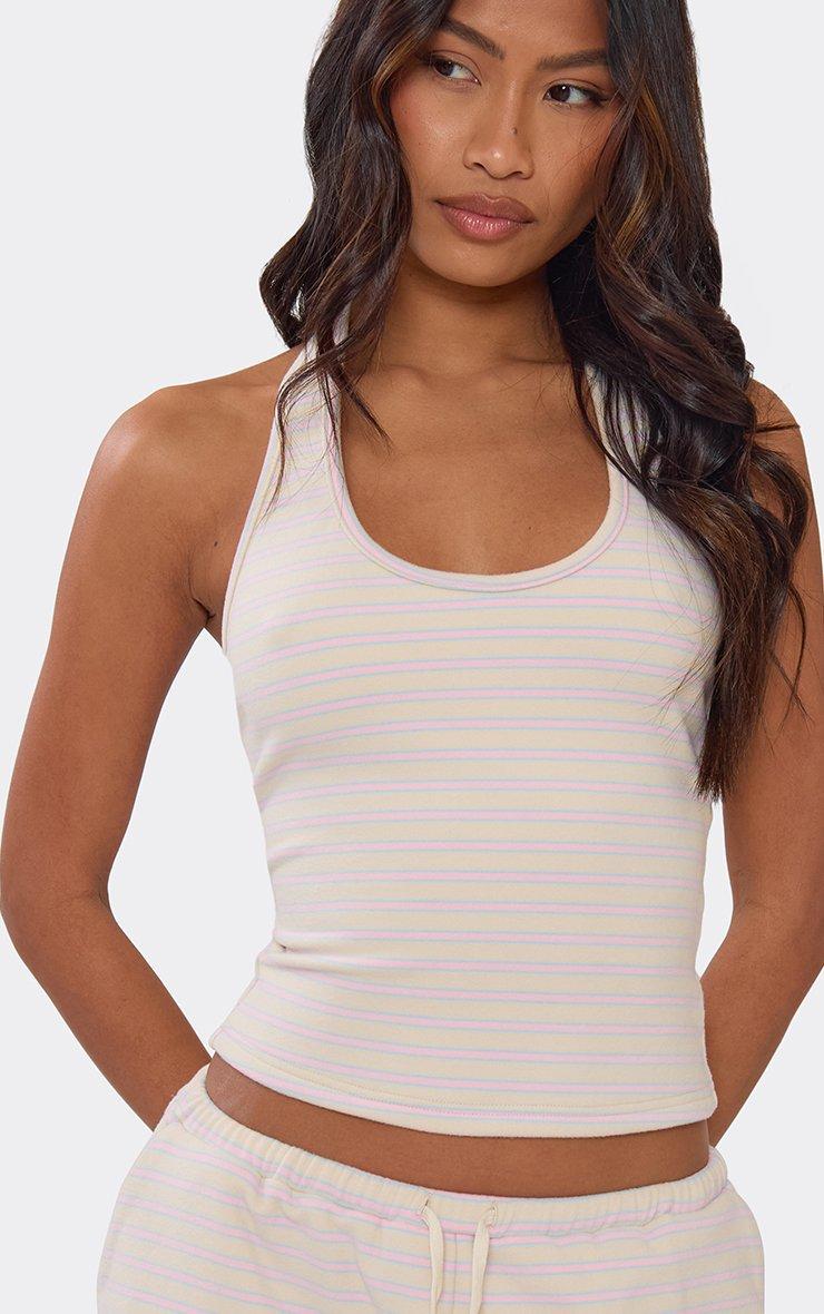 Halterneck Scoop Fitted Top In Pink Stripe Soft Fleece