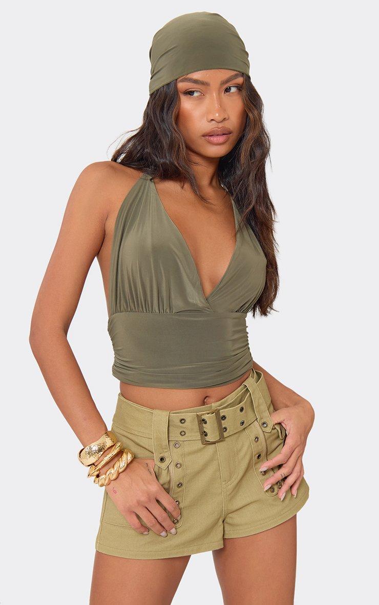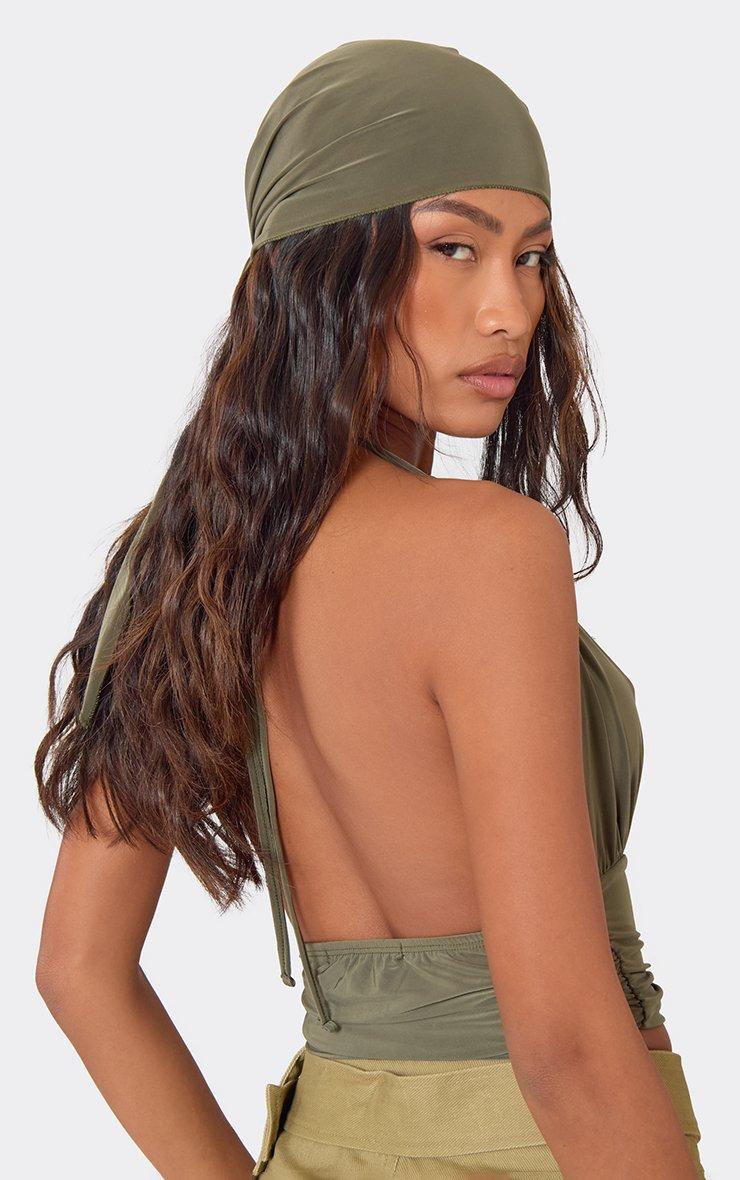 Halterneck Plunge Front Top With Bandana Head Scarf In Khaki Green