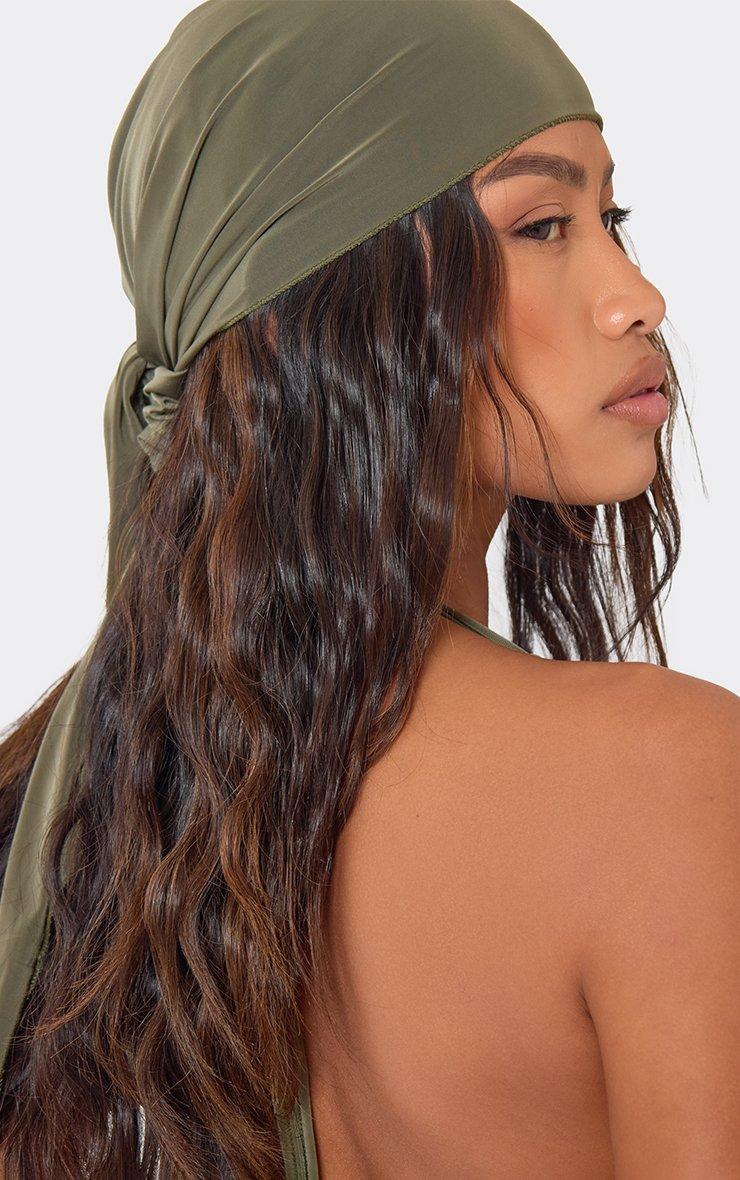 halterneck plunge front top with bandana head scarf in khaki green