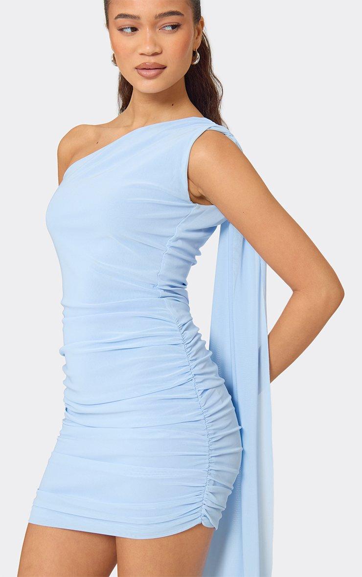 One Shoulder Drape Detail Ruched Mini Dress In Blue