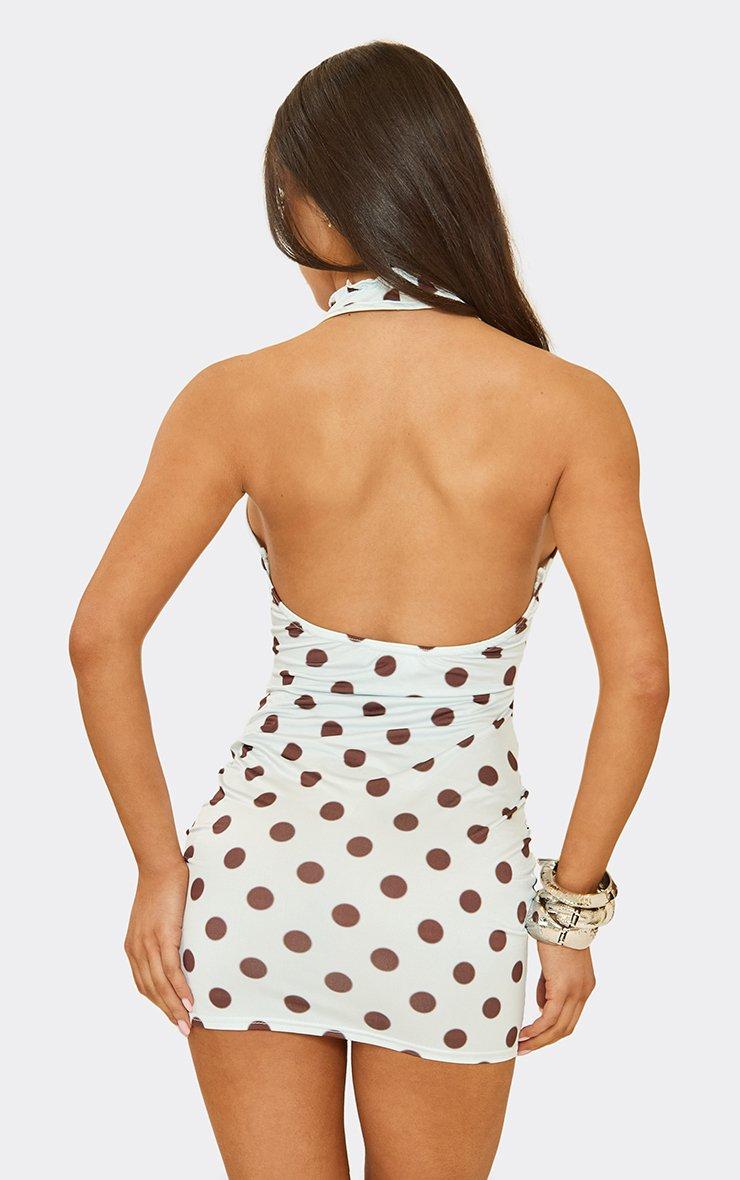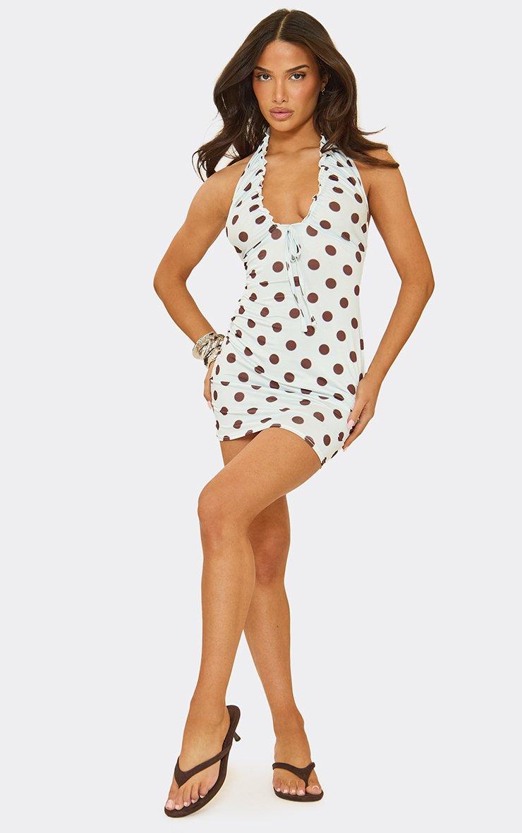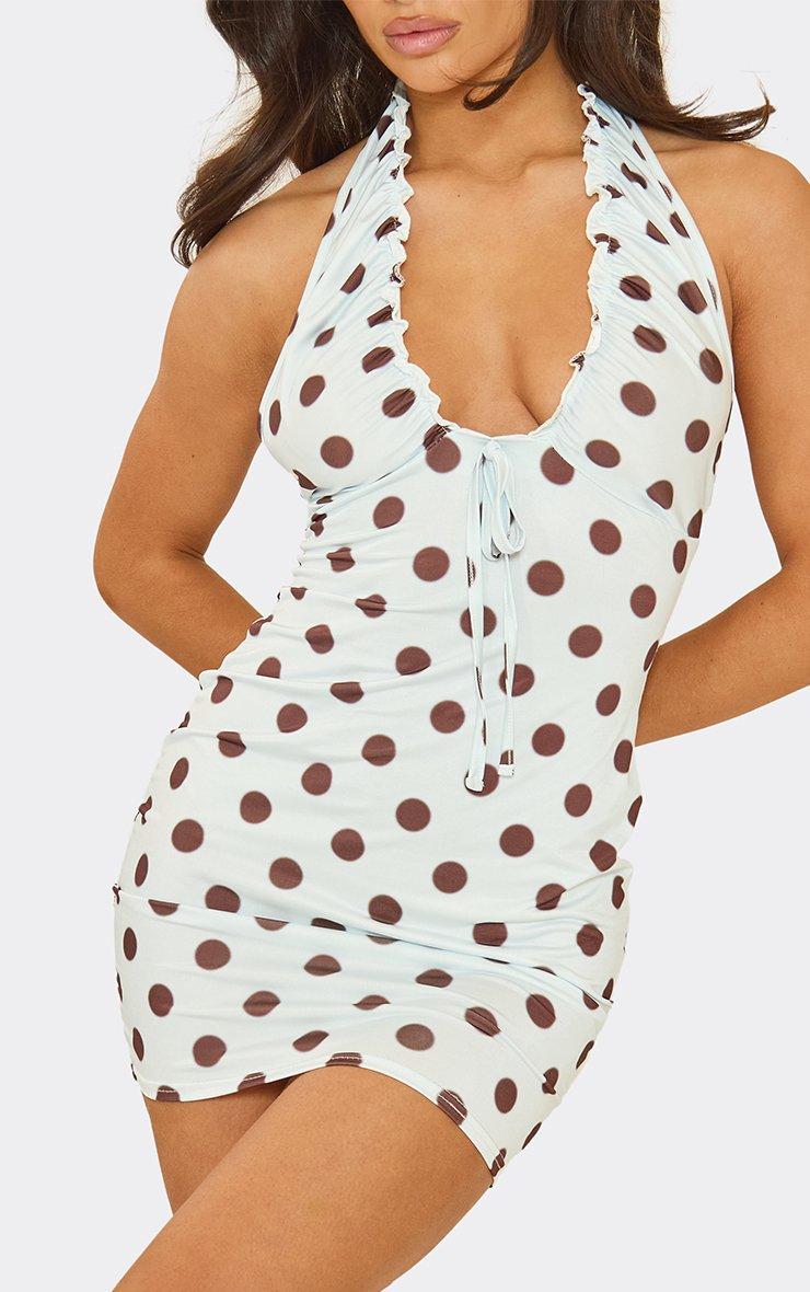 plunge halter neck tie detail mini dress in blue polka dot