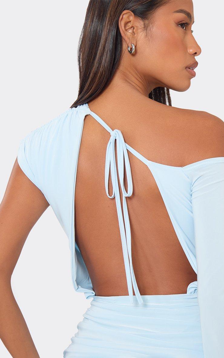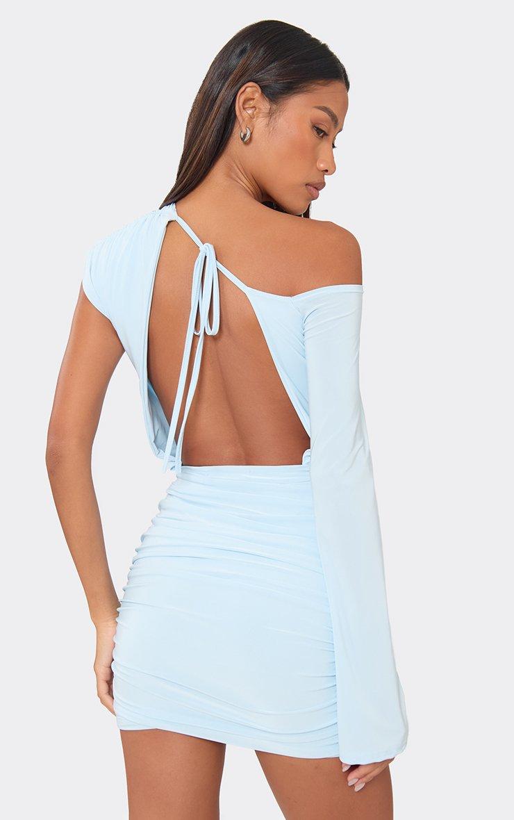 Asymmetric Ruched Tie Back Mini Dress In Blue Double Layer Slinky