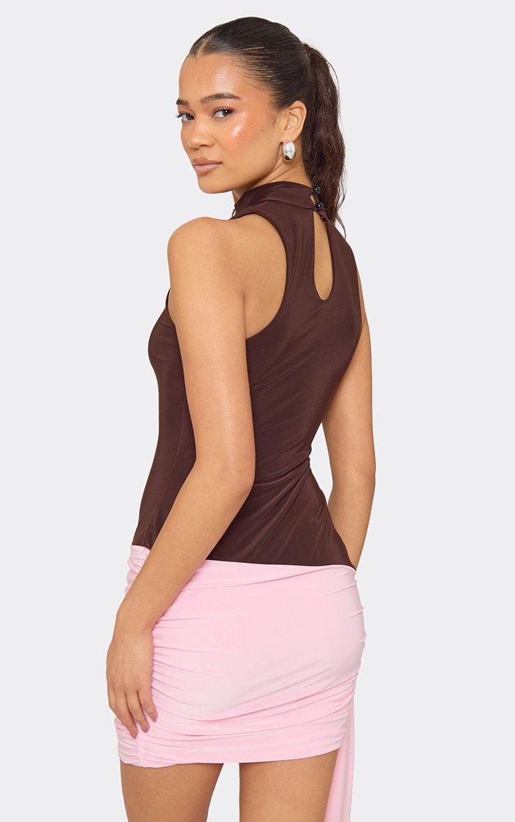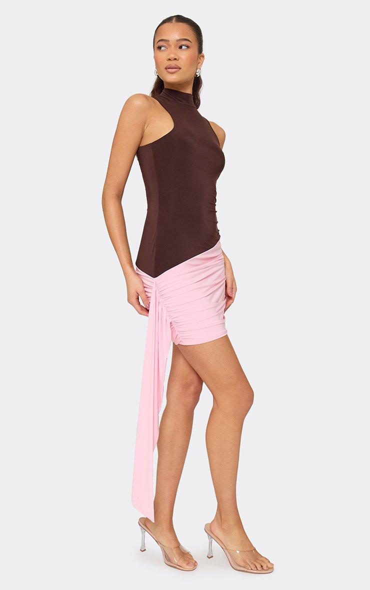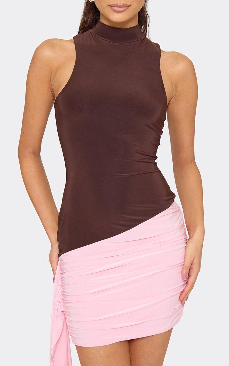 High Neck Contrast Drape Front Detail Mini Dress In Brown