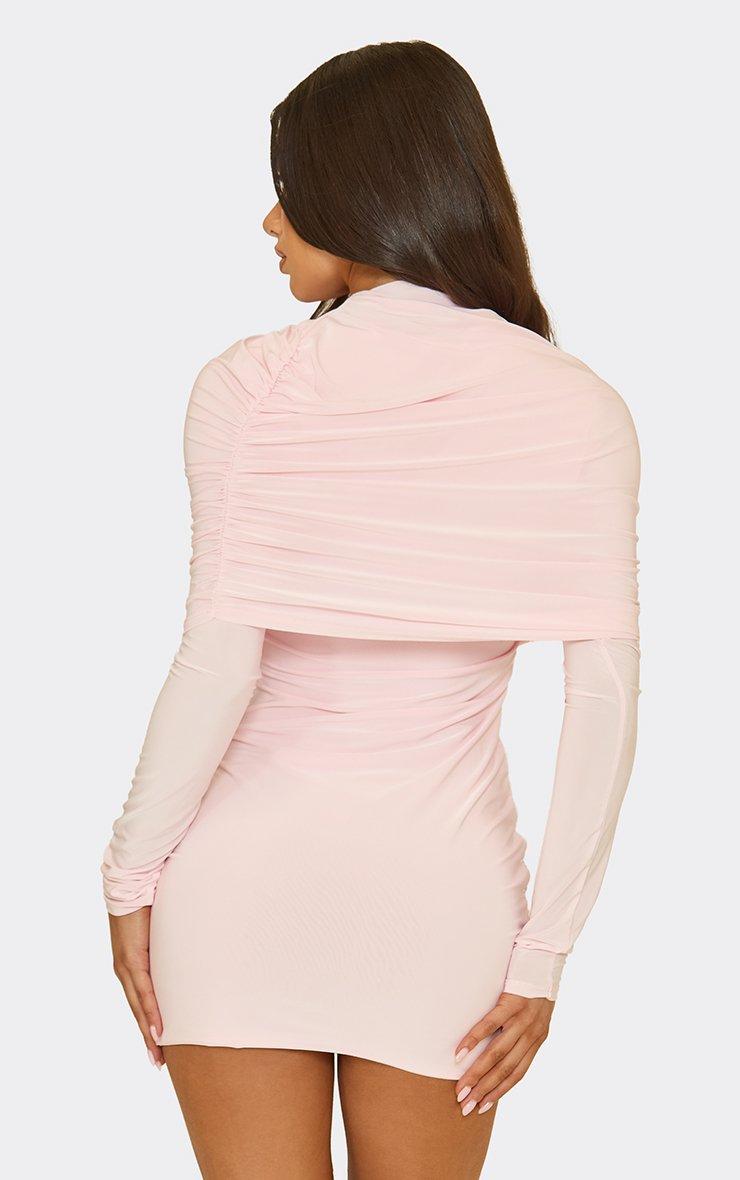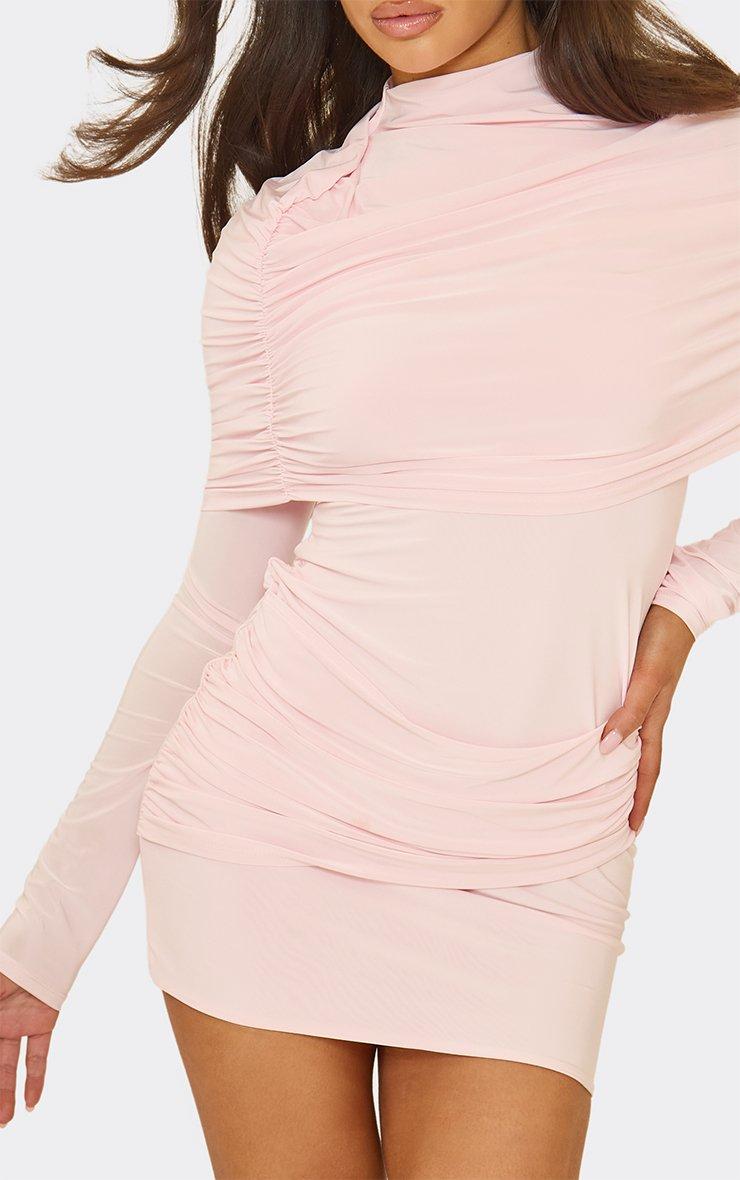 long sleeve high neck fold over ruched detail mini dress in baby pink