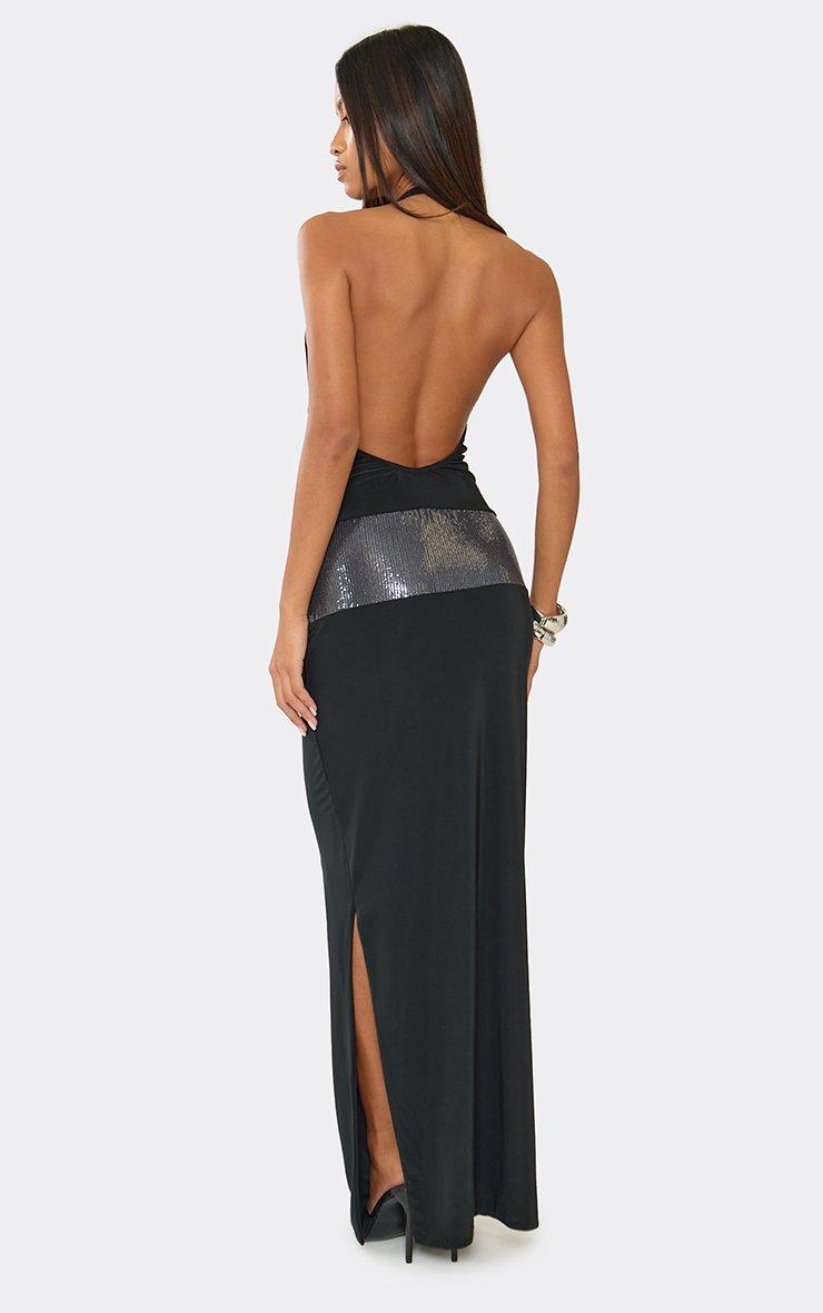 High Neck Sequin Panel Cut Out Split Leg Maxi Dress In Black