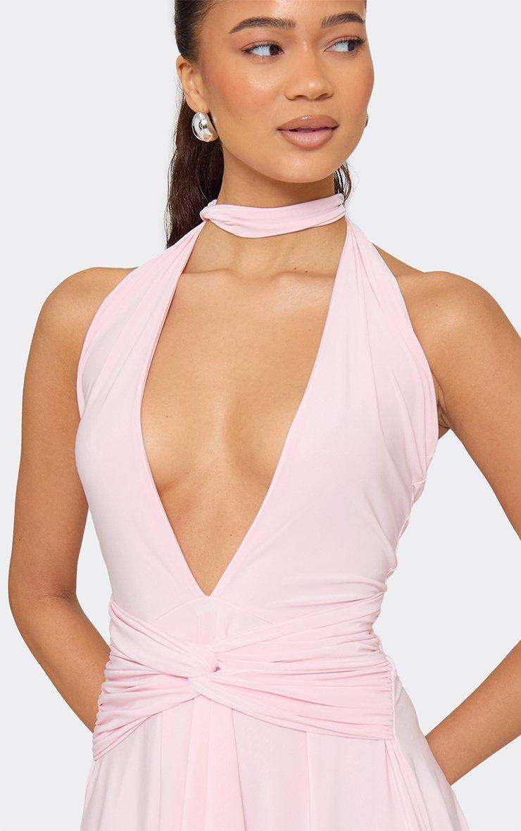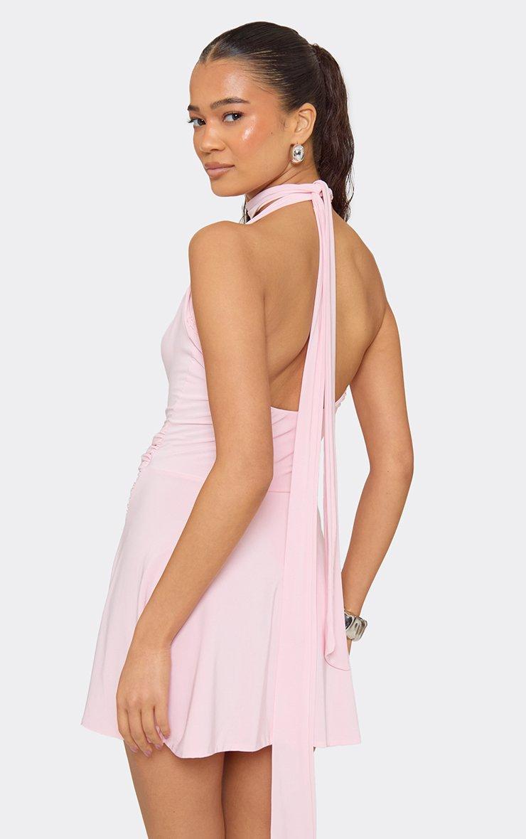 Plunge Front Scarf Knot Detail Mini Dress In Baby Pink