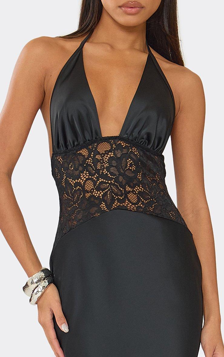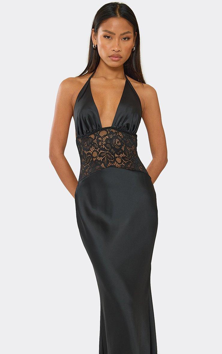 Halterneck Plunge Front Contrast Lace Panel Maxi Dress In Black Satin