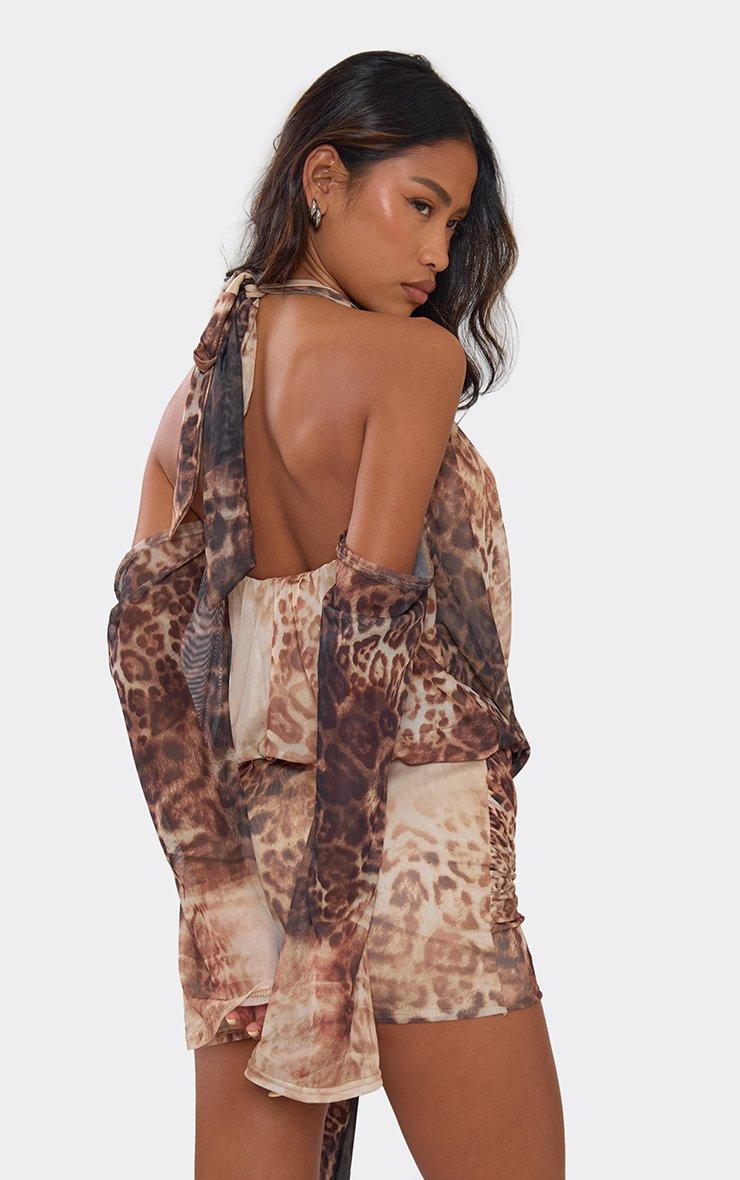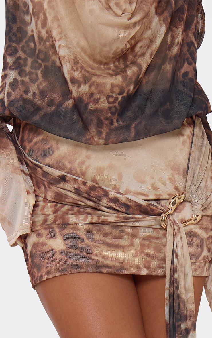 Cowl Neck Drape Trim Detail Mini Dress In Brown Animal Print