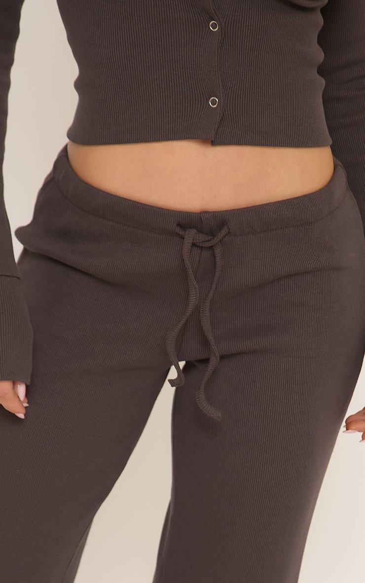 mid rise drawstring waist straight leg trousers in dark brown ribbed