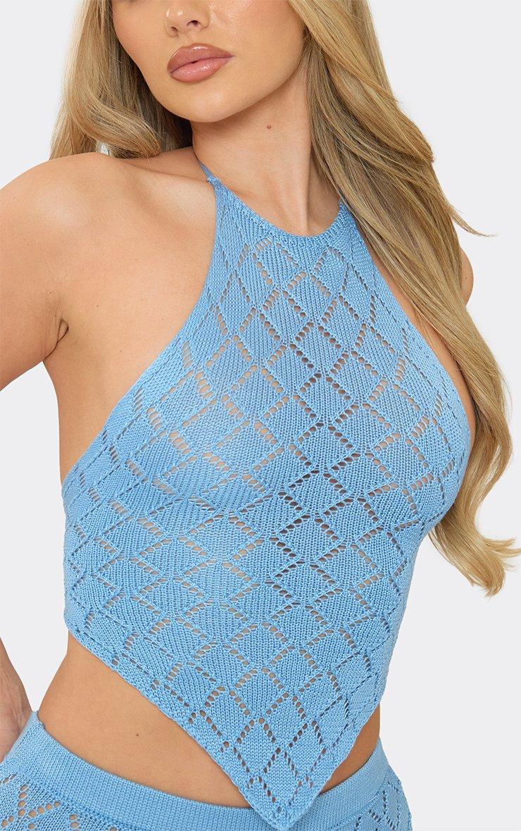 Halterneck Tie Back Pointed Hem Top In Blue Crochet Knit