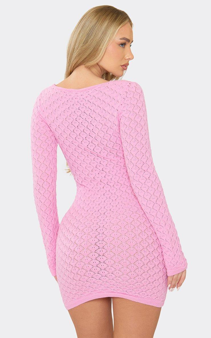 Long Sleeve Trim Detail Mini Dress In Pink Crochet Knit