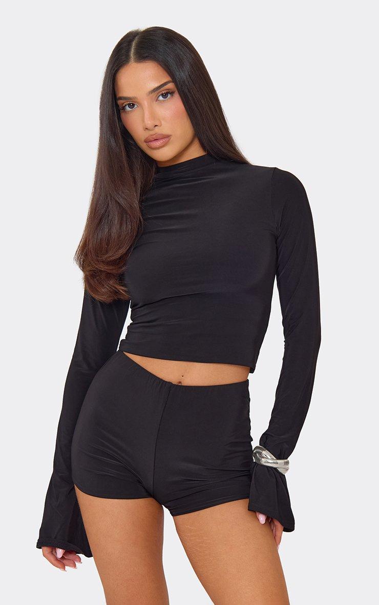 Bell Sleeve High Neck Top In Black Slinky