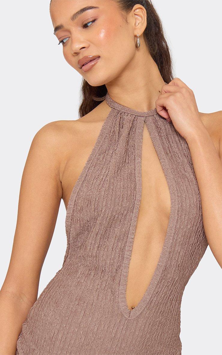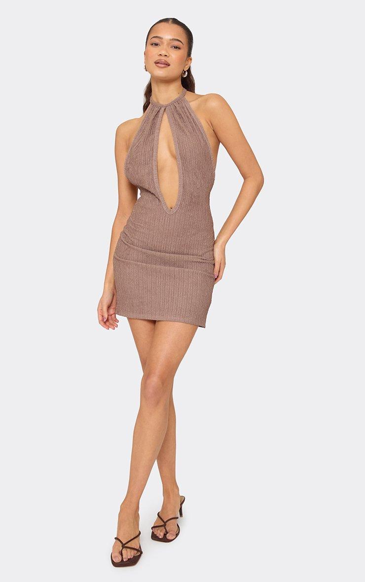 halterneck keyhole cut out mini dress in brown