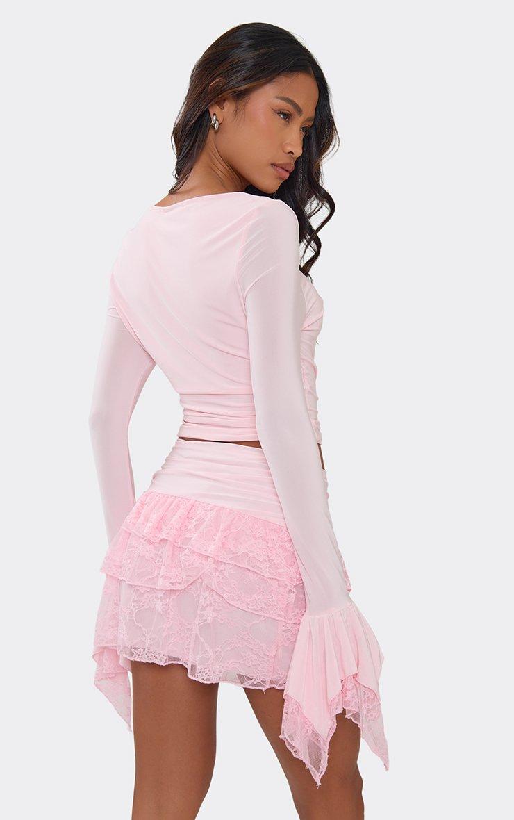 Long Bell Sleeve Lace Trim Top In Pink