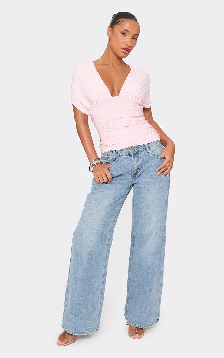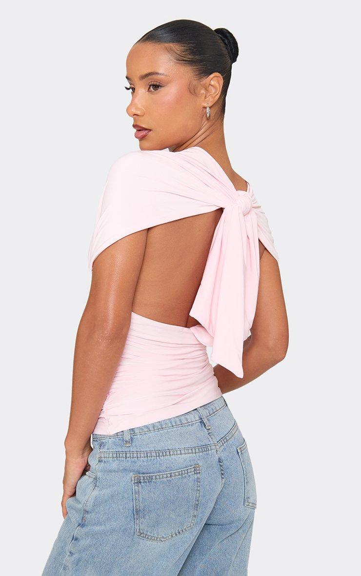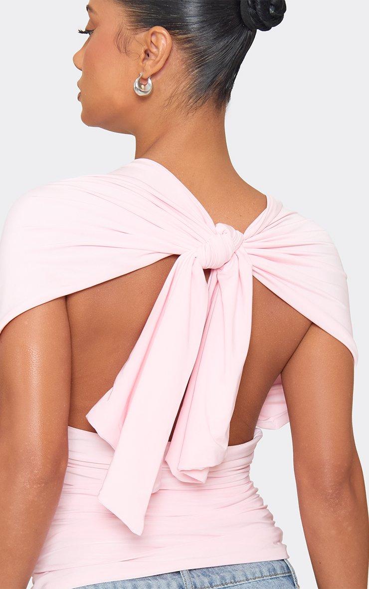 Short Sleeve Plunge Front Tie Back Detail Top In Pink Slinky