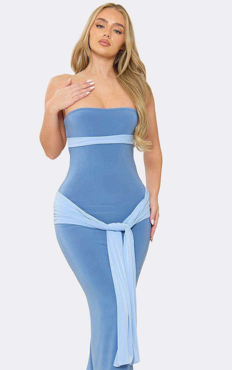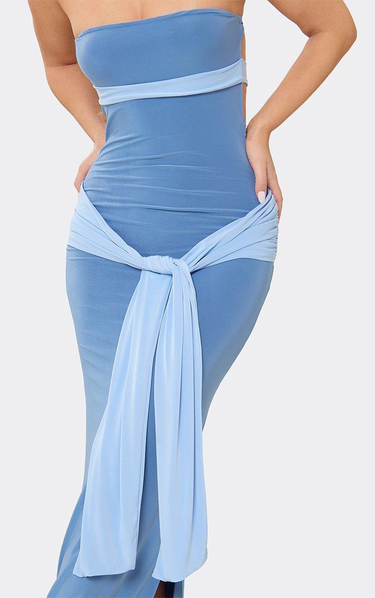 Bandeau Cut Out Drape Detail Colour Block Maxi Dress In Blue Slinky