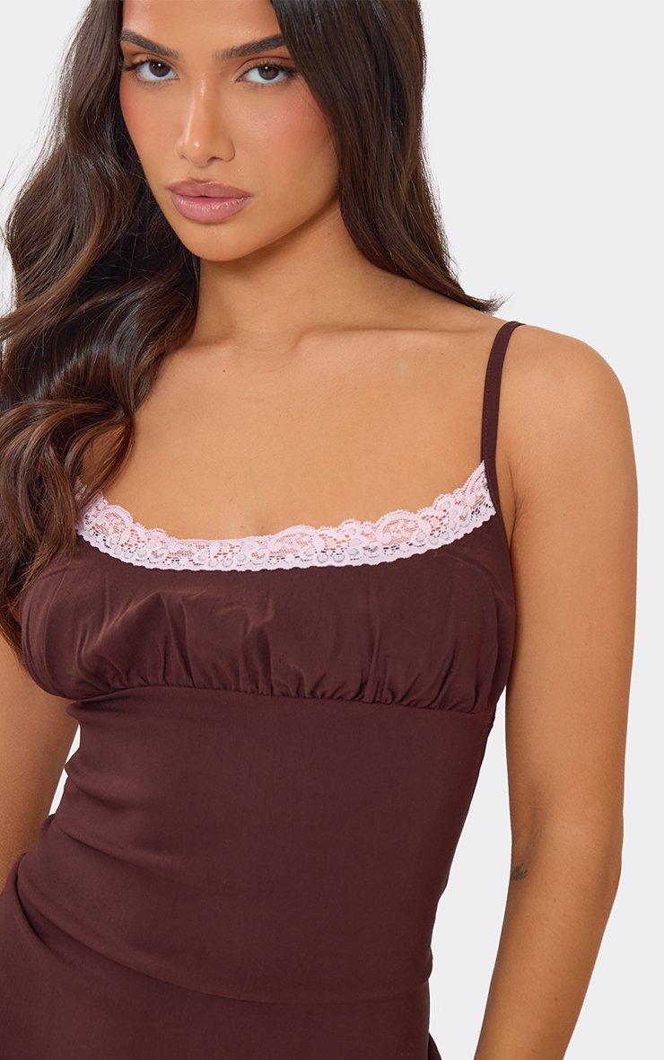 Strappy Contrast Lace Trim Ruched Bust Mini Dress In Chocolate Brown