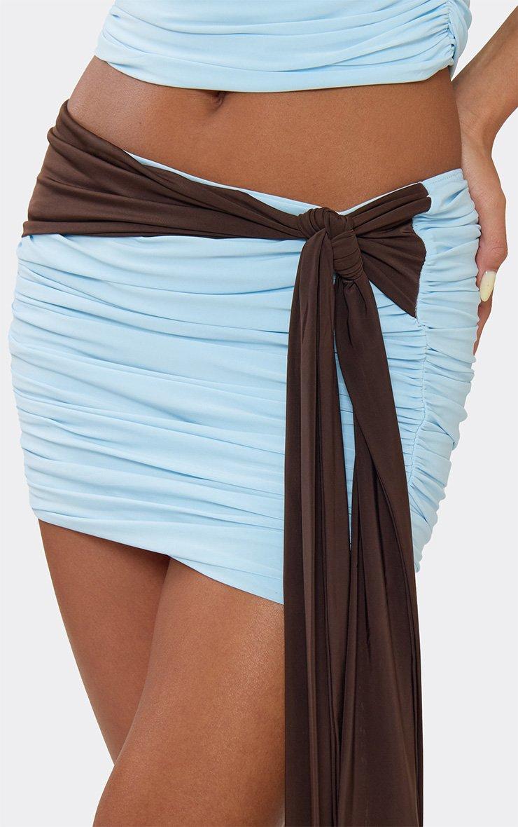 Low Waist Contrast Drape Detail Ruched Mini Skirt In Baby Blue Slinky