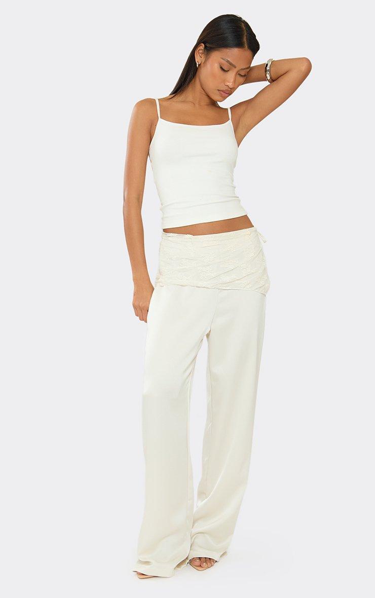 mid rise lace waist panel detail straight leg trousers in cream satin