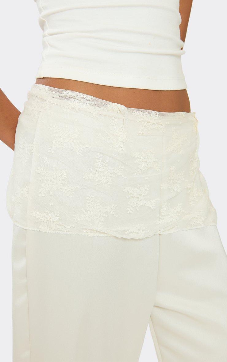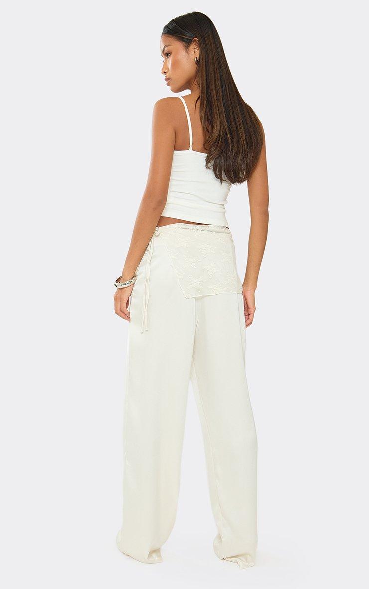 Mid Rise Lace Waist Panel Detail Straight Leg Trousers In Cream Satin