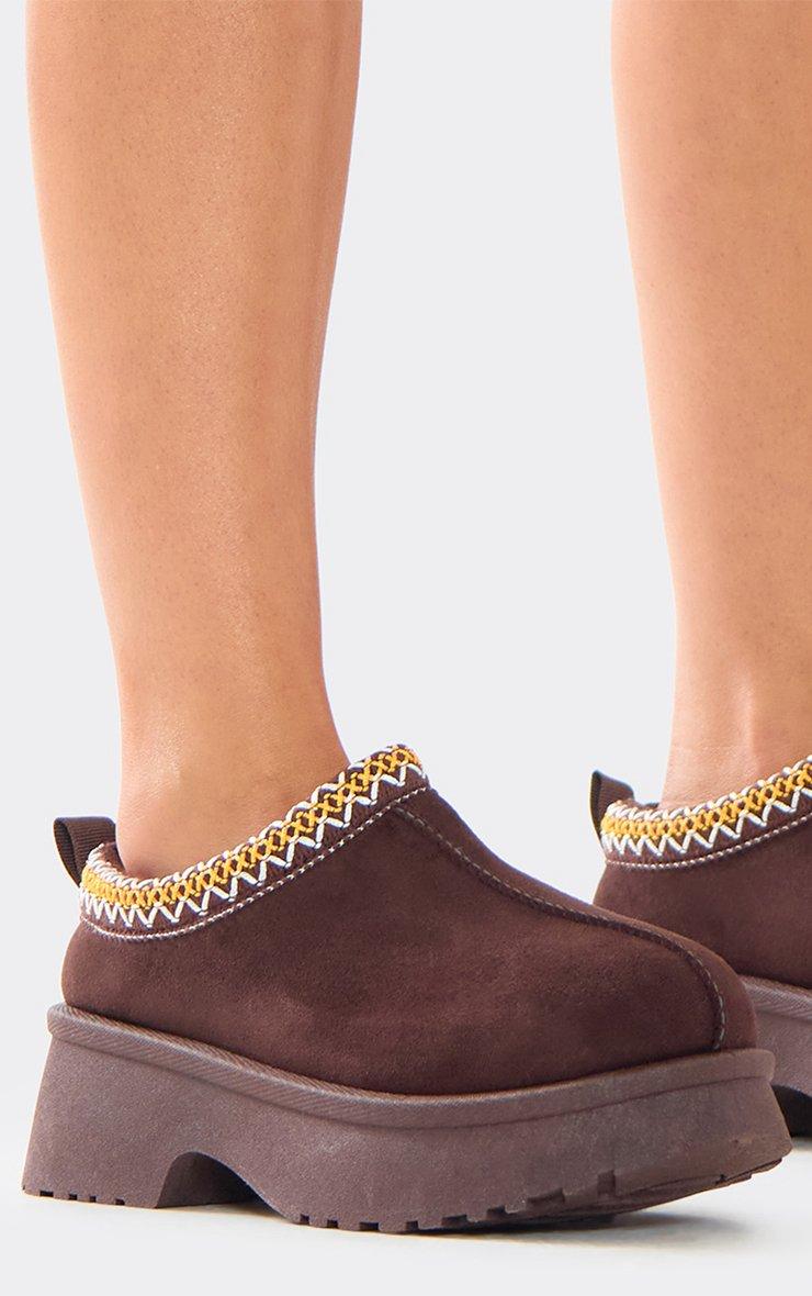kata platform sole aztec detail faux fur lining slipper in brown faux suede