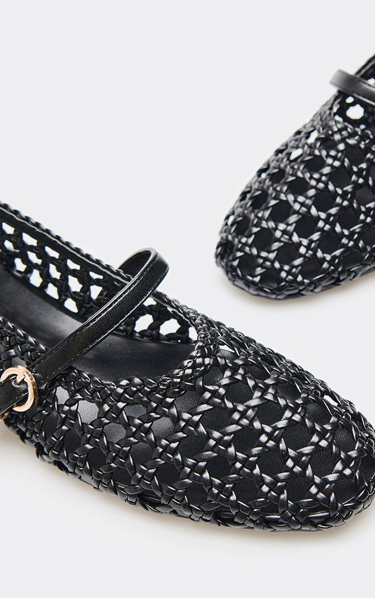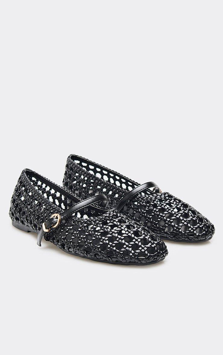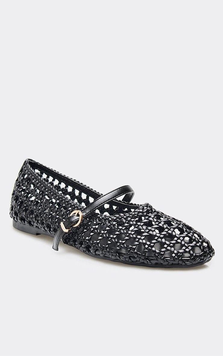 Almond Woven Detail Buckle Strap Ballet Pump In Black Faux Leather