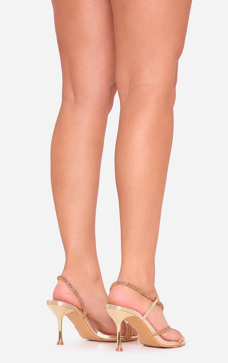 Second-Date Diamante Ankle Strap Stiletto Heel In Gold Faux Leather