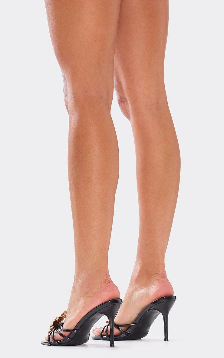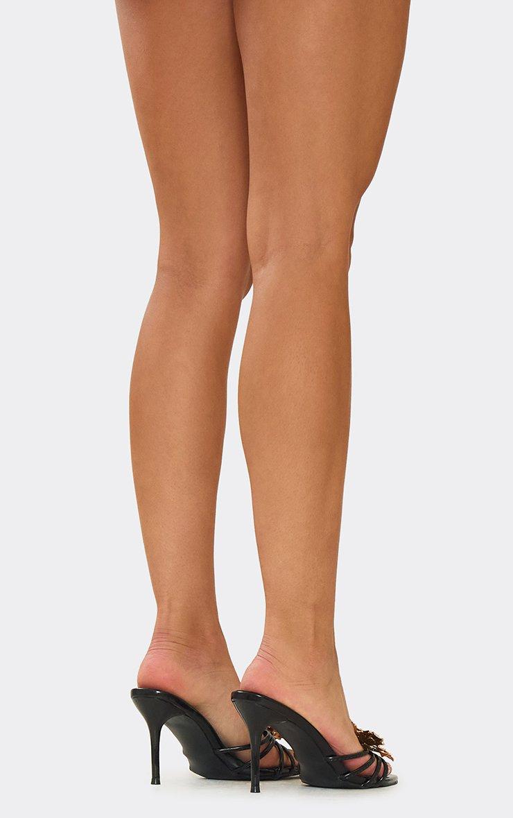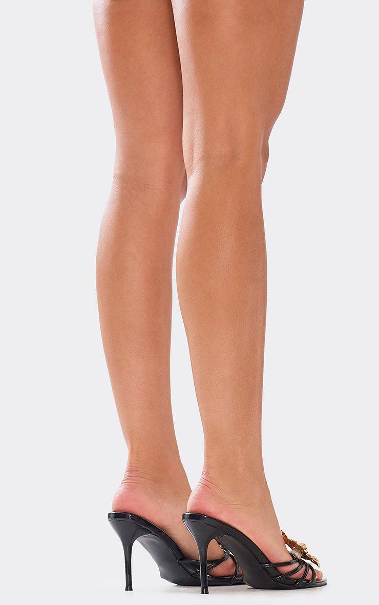 Sweety Strappy Flower Detail Pointed Toe Stiletto Heel Mule In Black Patent