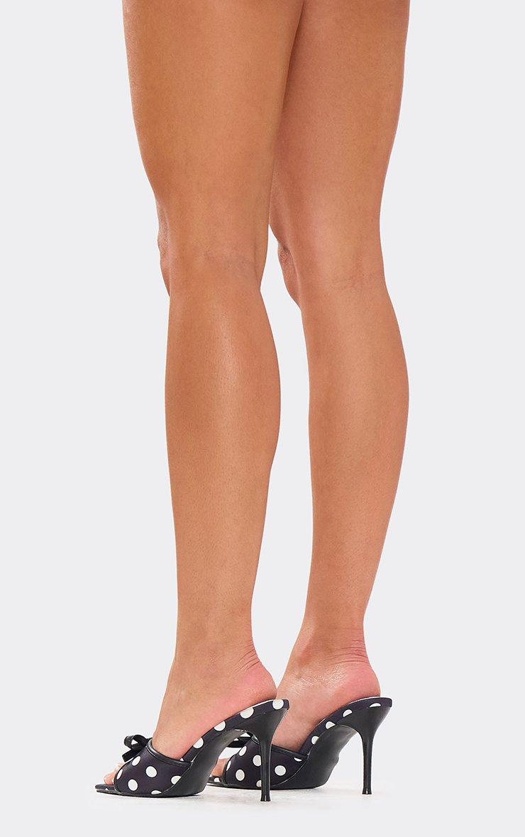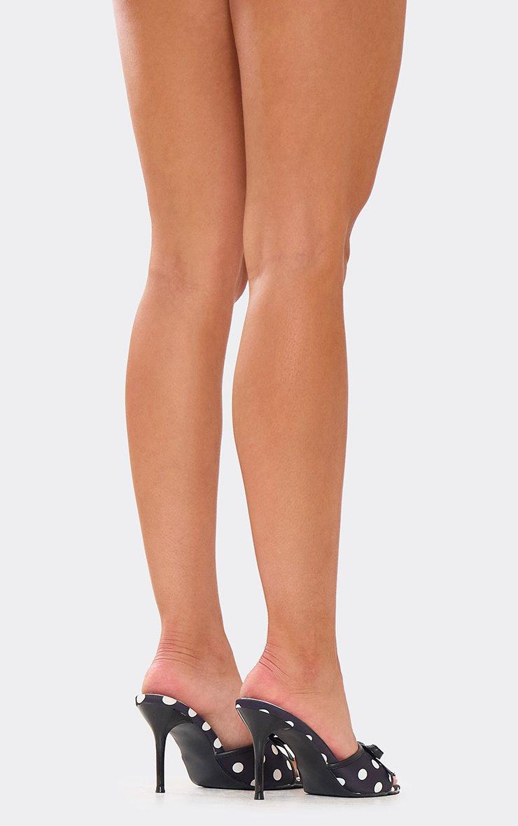 miles bow detail peep toe stiletto heel mule in black polka dot print satin
