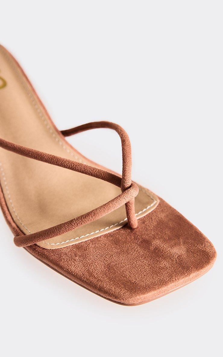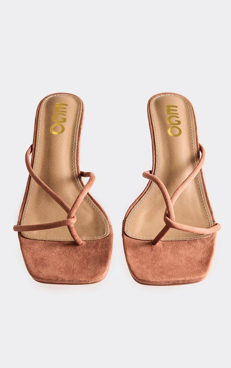 Ostara Faux Feather Thong Strap Heeled Mule In Taupe Faux Suede