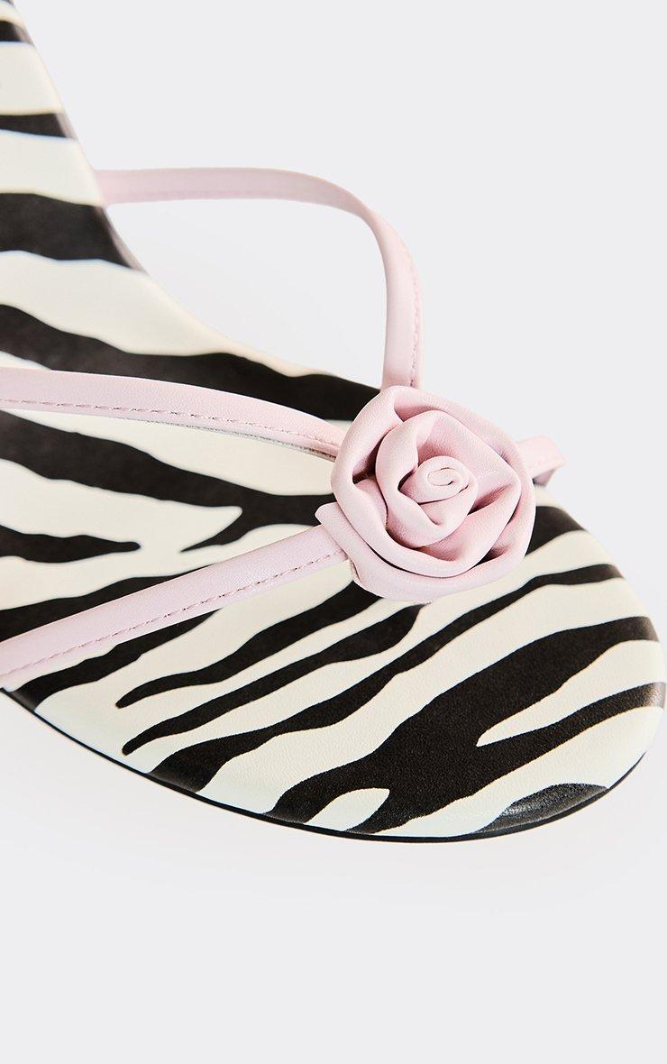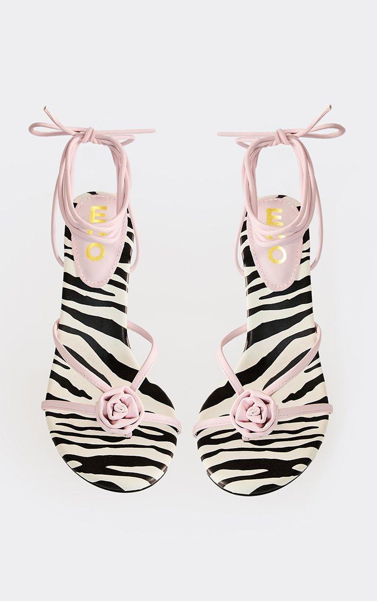 rosebud contrast flower detail wrap up stiletto heel in zebra print faux leather