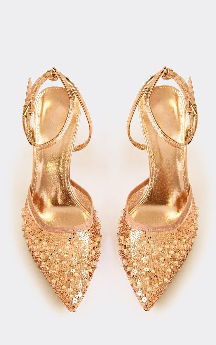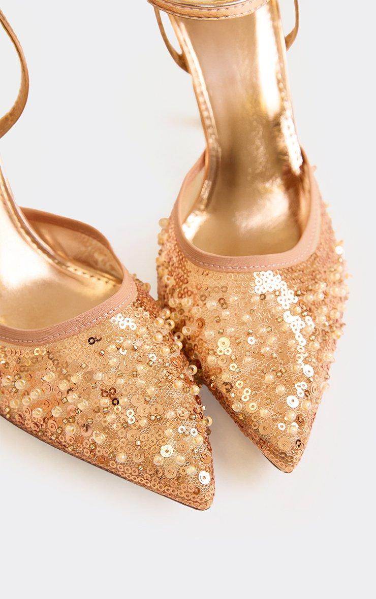 puddle sequin detail ankle strap pointed toe court heel in bronze faux leather
