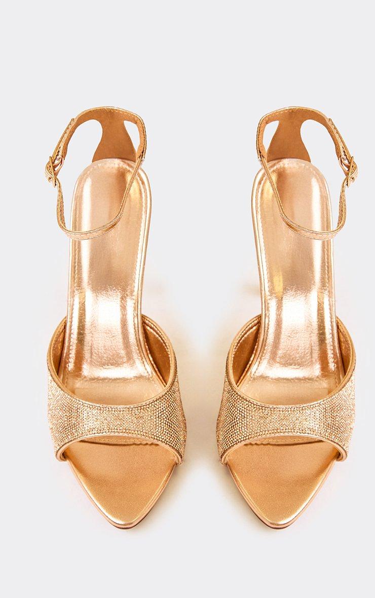 quality diamante detail pointed peep toe ankle strap stiletto heel in bronze faux leather