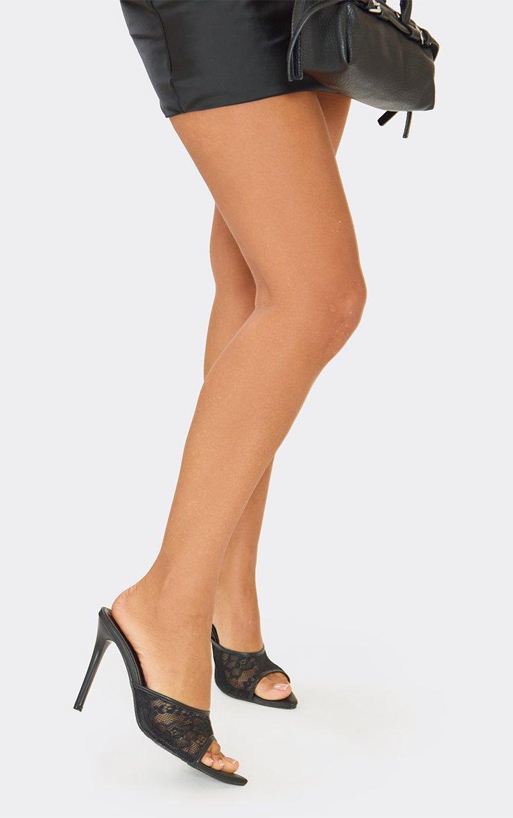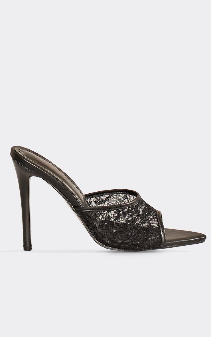 framed contrast lace detail pointed peep toe stiletto heel mule in black faux leather