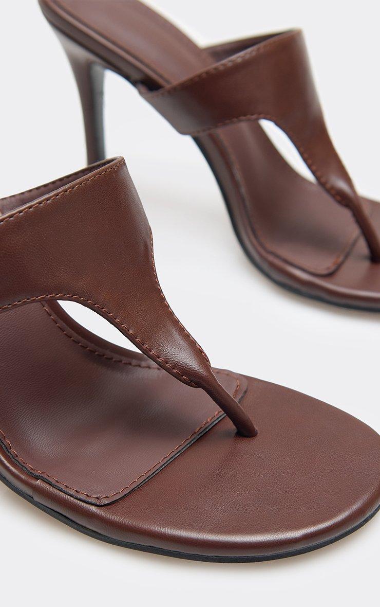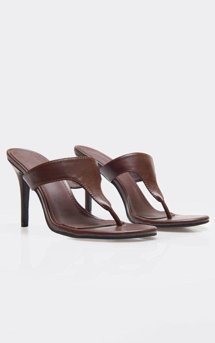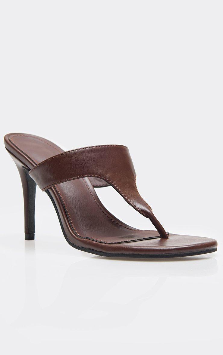 Fleur Thong Strap Stiletto Heel Mule In Brown Faux Leather
