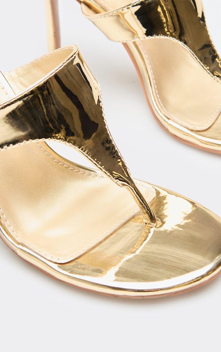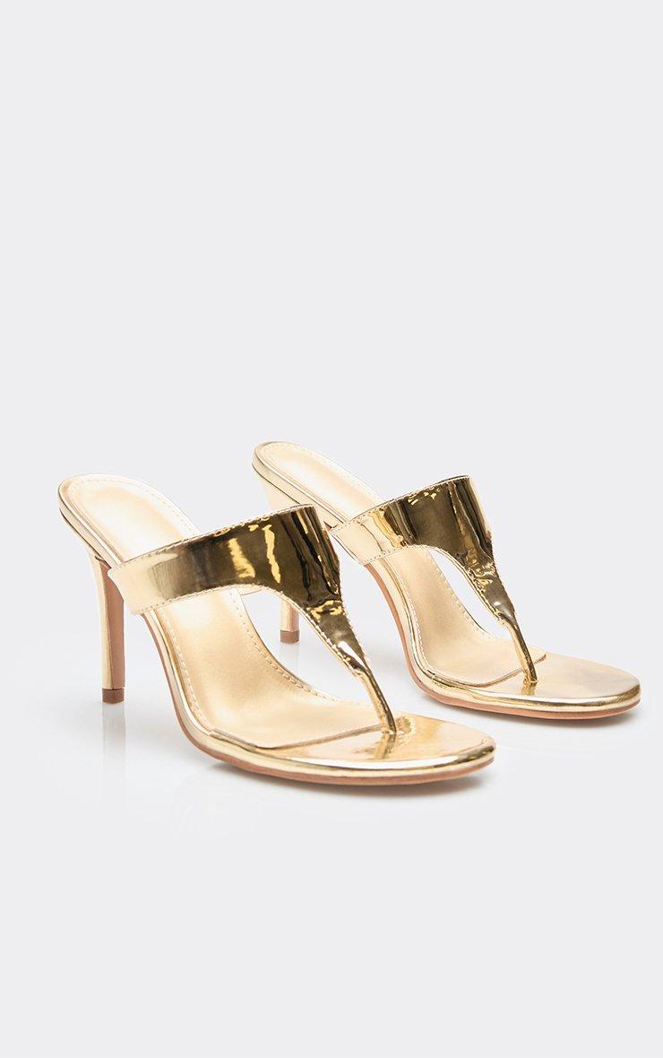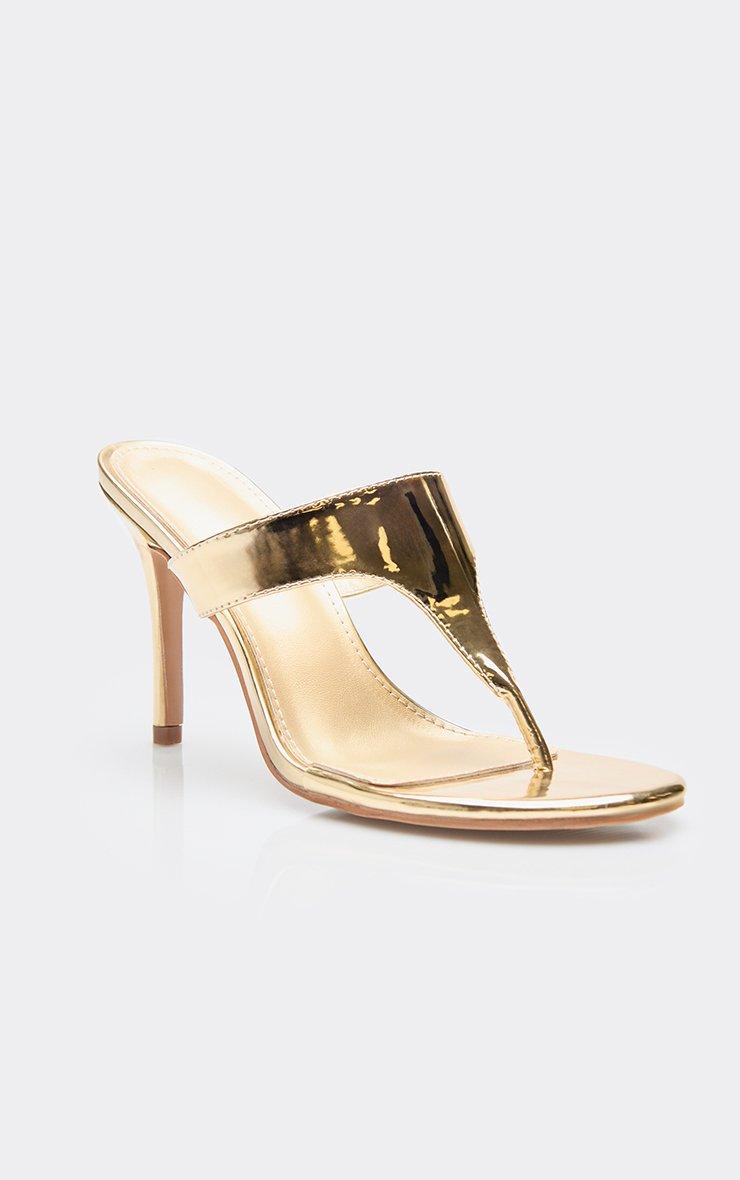 Fleur Thong Strap Stiletto Heel Mule In Gold Patent