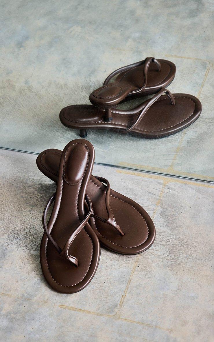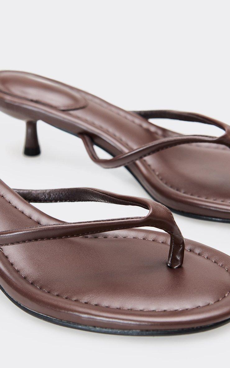 vinny thong strap kitten heel mule in brown faux leather