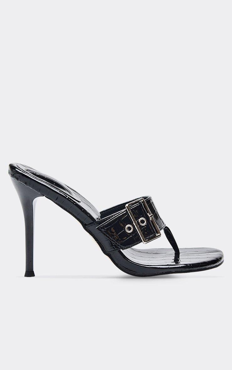 kora thong buckle strap heeled mule in black croc print faux leather