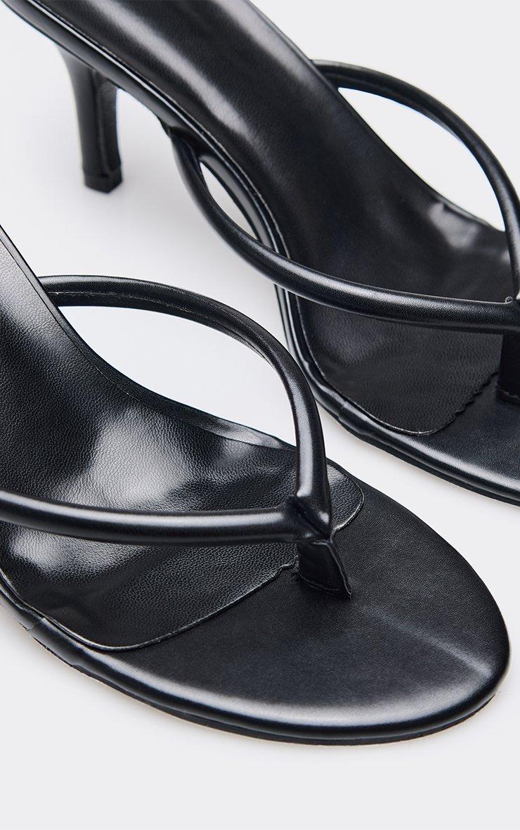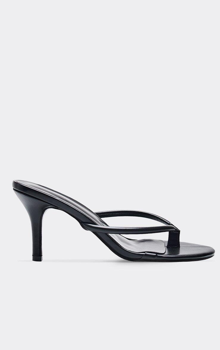 Elphie Thong Strap Heeled Mule In Black Faux Leather