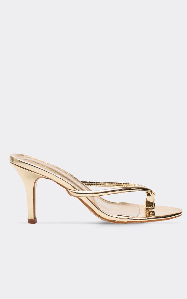 Elphie Thong Strap Heeled Mule In Gold Faux Leather