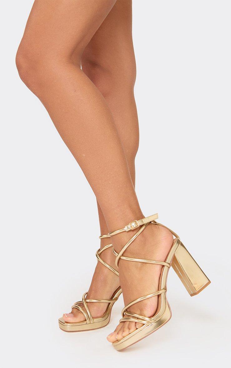 cozmo strappy block heel in gold faux leather