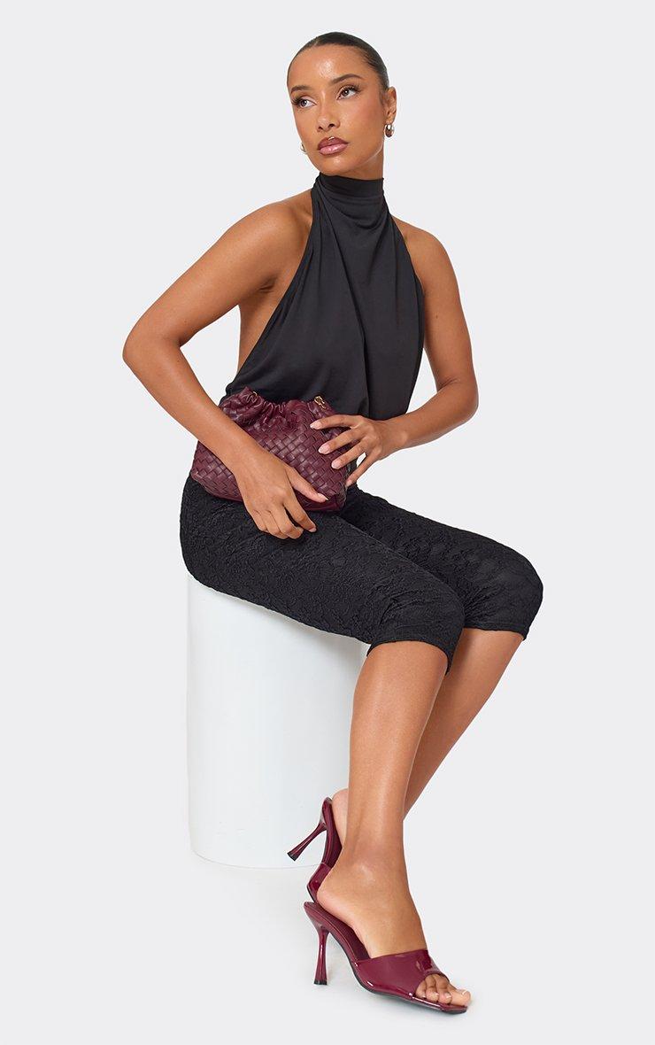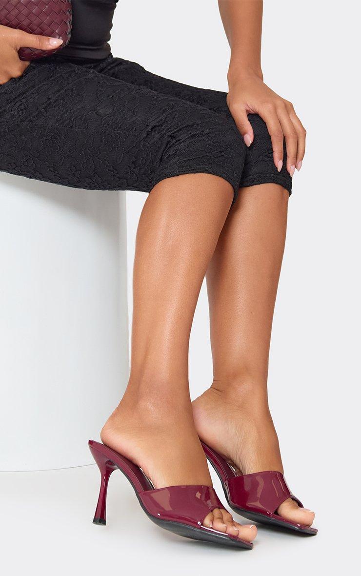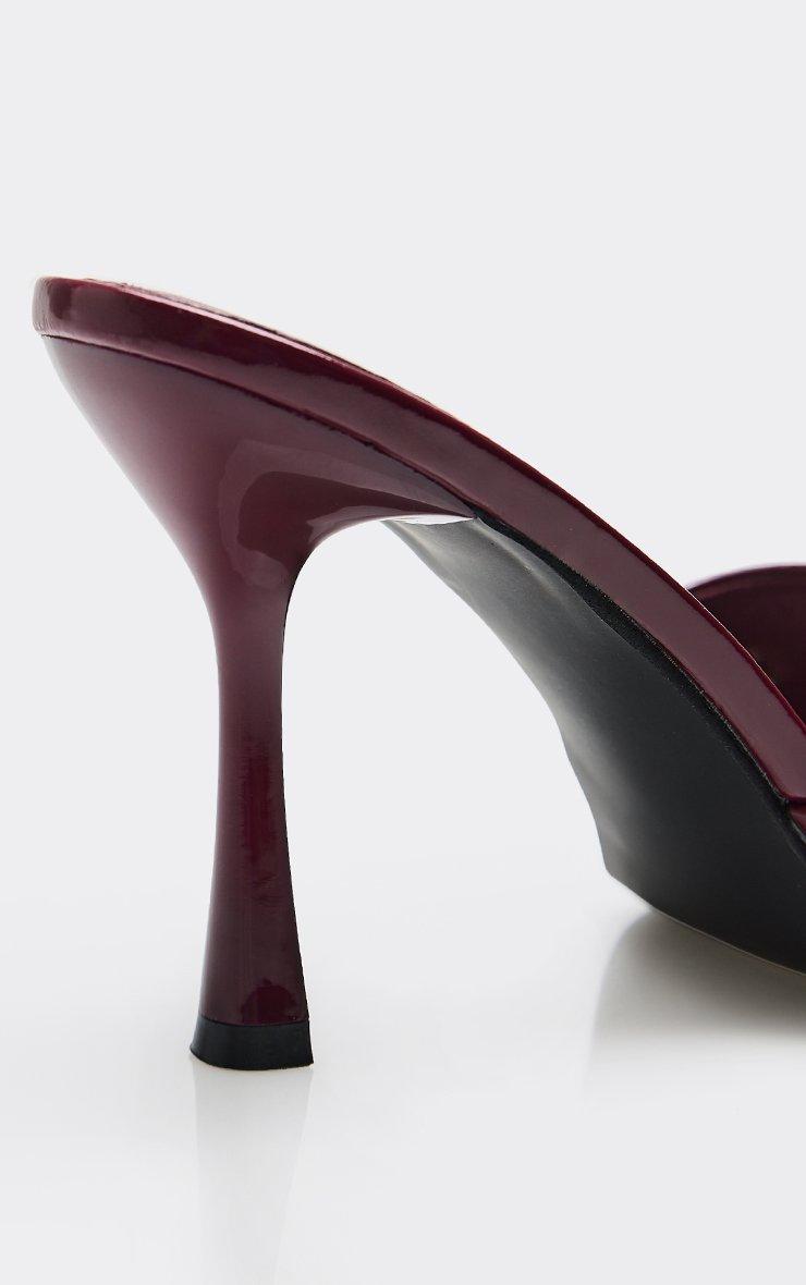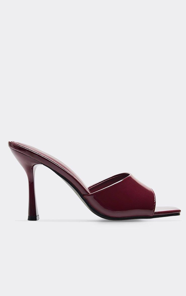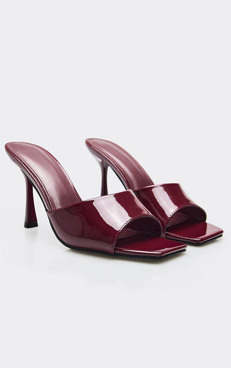 gaia square peep toe stiletto heeled mule in burgundy patent