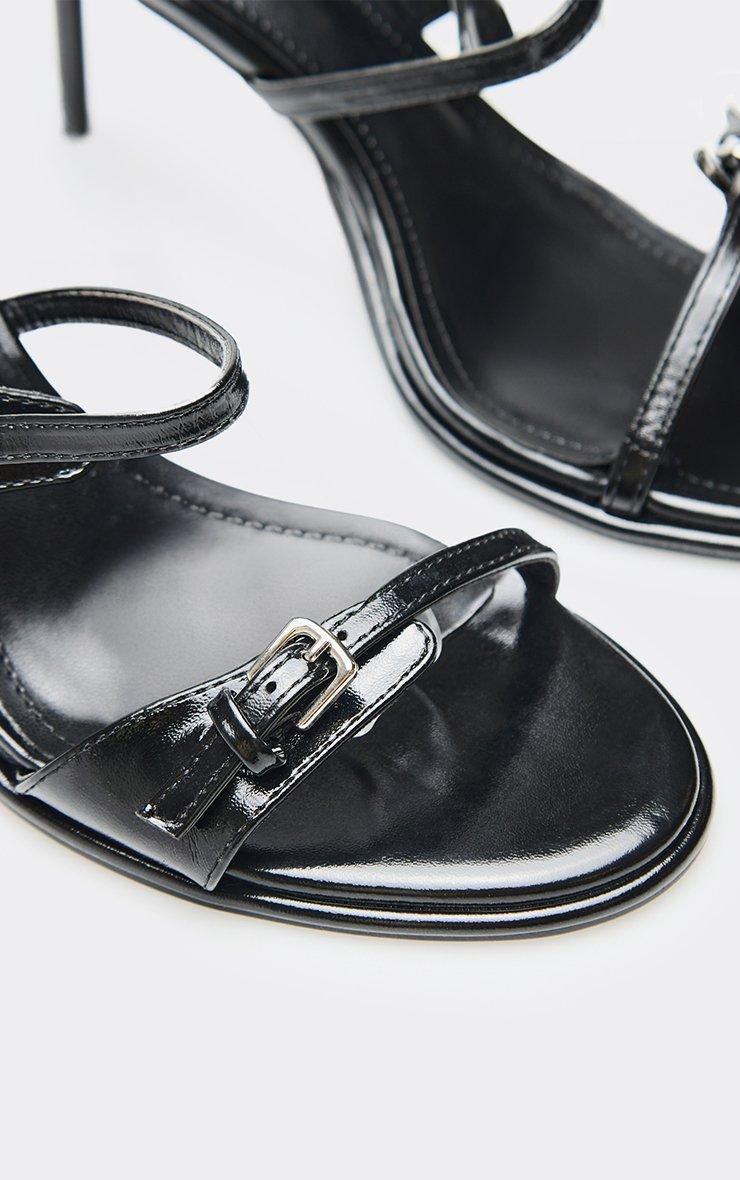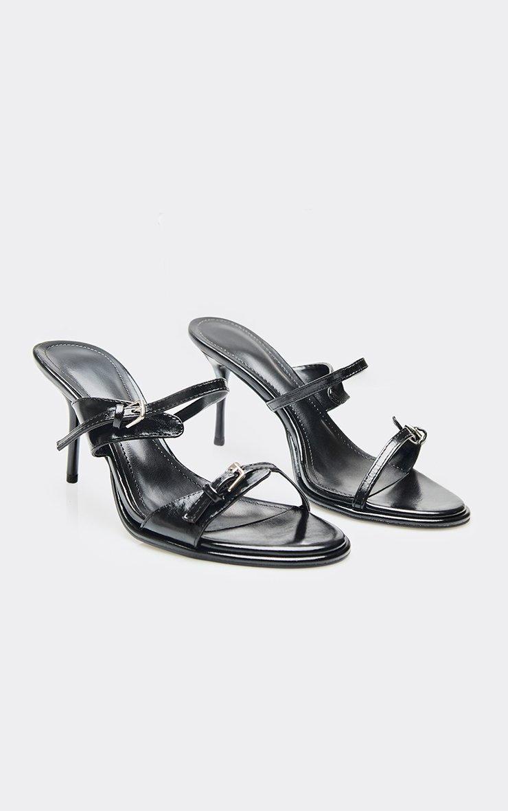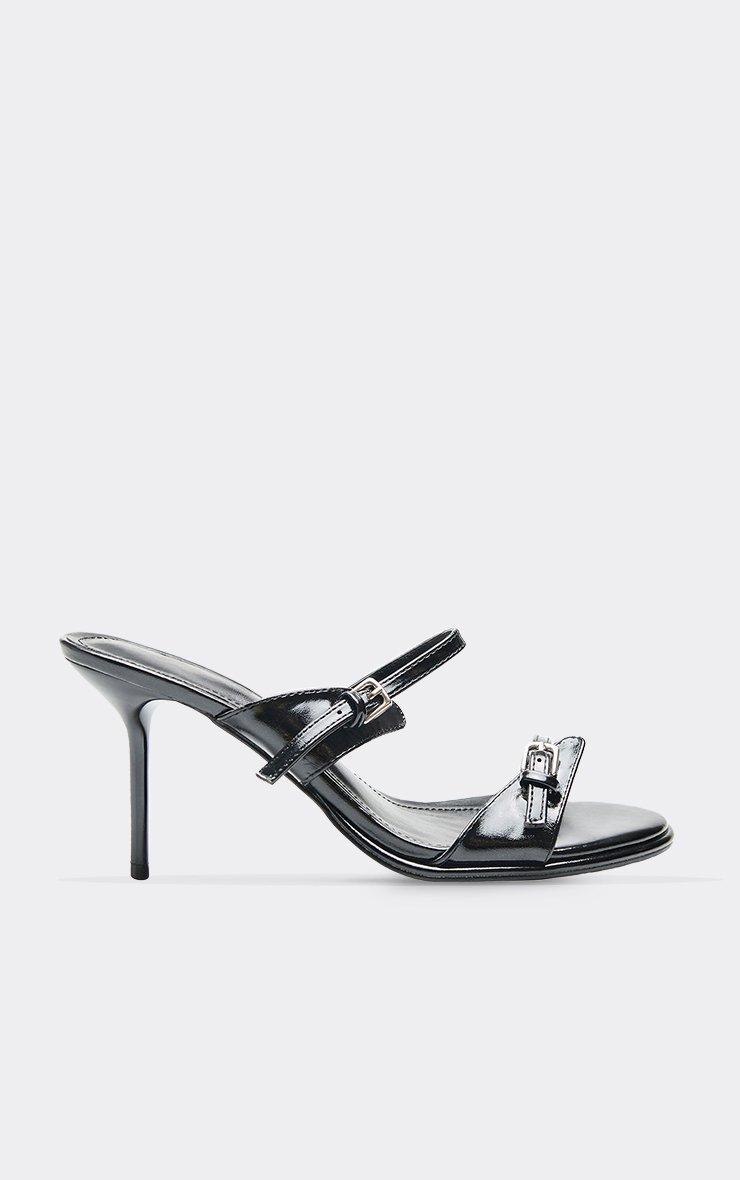Fawn Double Buckle Strap Detail Heeled Mule In Black Faux Leather