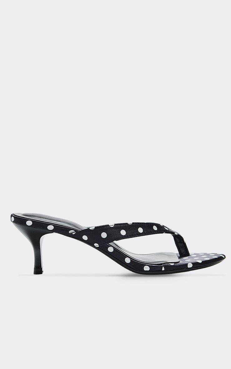 Dotti Thong Strap Kitten Heeled Mule In Black Polka Dot Print Satin