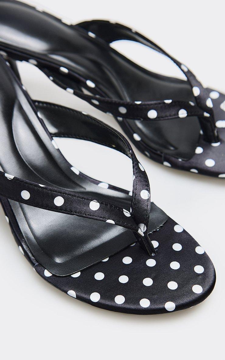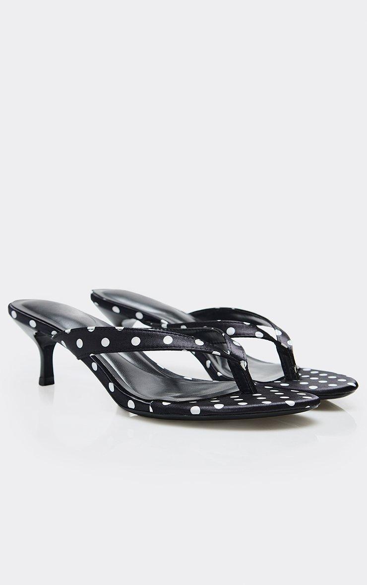 dotti thong strap kitten heeled mule in black polka dot print satin