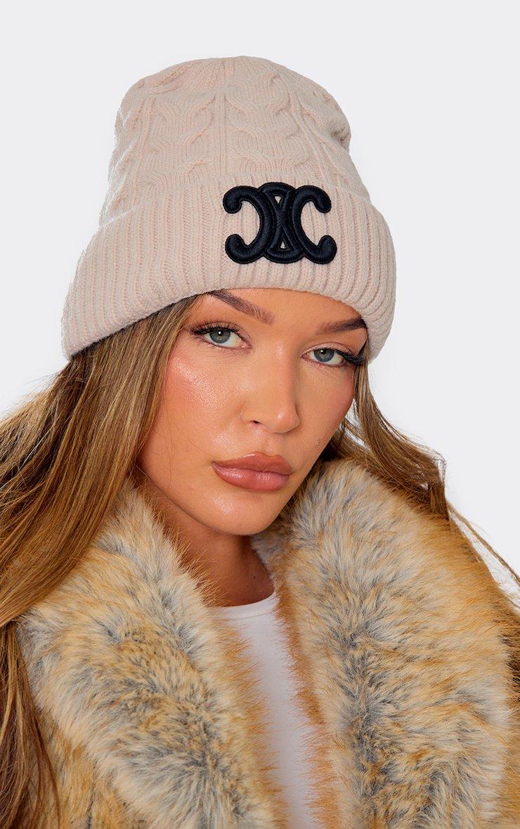 Logo Detail Beanie Hat In Beige Cable Knit