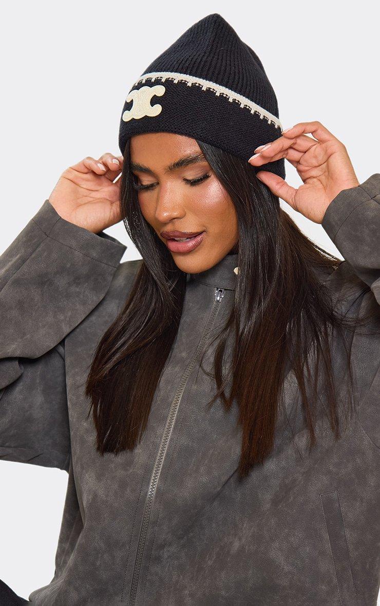 Logo Detail Contrast Trim Beanie Hat In Black Knit