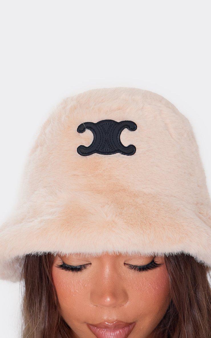 Contrast Logo Detail Bucket Hat In Beige Faux Fur